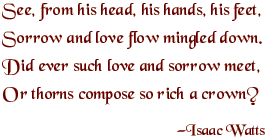 For me, the Holy Week experience is a cornerstone of my faith life. The liturgies are so rich, so evocative. This spiritual journey is such a deep and powerful experience for me each year. The ultimate meaning of human suffering, life and death, love and redemption--in a way that cannot be explained, only experienced. Each year it becomes more three-dimensional for me, gains more depth, as I grow in my own humanity. I remember the year that I first grasped the dimension of love in it. It was the year Damian died. I learned to see love reflected in grief. At his funeral I had a revelation, as I saw the love with which we celebrated that funeral Eucharist, and especially as we censed the coffin and sprinkled it with water to recall the promises of his baptism. It was done with such love--sorrow to be sure, but also love... Two months later, it was Holy Week, and we mirrored that same action, experiencing the same feelings. Only this time it was the body of Christ. Visions are hard to explain, but it was as if I suddenly saw love radiating through every plane of relationship--the loving care of a lover for the body of his beloved... the loving care of those who prepared Jesus’ body for burial... the loving care of my friends for me... the loving care of God for us. The rhythms of the ceremonial actions, the rhythms of the words, the deeper alpha rhythms of the liturgy, the music which in its intimacy can contain joy and sorrow and love in one note. It was the first time that I felt so deeply loved by anyone, loved by God. It was the most astounding vision. Right now as I am writing this I can’t help the tears flowing because it was such a deep feeling. For the first time in twenty five years I am reluctant to begin the Holy Week services. Too much emotion, too much activity. Palm SundayTomorrow, Palm Sunday, is the overture. Holy Week begins. We begin our journey as we recall Jesus beginning his final journey. I am uneasy. The experience is powerful, and right now I don’t know if I have the capacity to bear it. The depth of these experiences feels to me like a very loud sound, from which I shrink. Too much sorrow... too much love. The colors of the day are a deep red, recalling the blood of Christ. Festive decorations are removed from the church, leaving it simple and empty, with room for what is to come. The service begins with the procession recalling his triumphal entry into Jerusalem. While it is filled with grandeur, there is a mood of solemn anticipation, because we know what will come next, just as Jesus knew. We must now confront our own destiny, just as Jesus confronted his. In the midst of the service, the tone changes dramatically. As together we read the story of Jesus’ suffering and death, we must encounter what that story means for us, today. When the reading tells of the death of Jesus, we pause for a few minutes of silence, and kneel in reverence and reflection. At this service there is a hymn which contains these words: “Love so amazing, so divine, demands my soul, my life, my all.” Despite my apprehension, I cannot resist. I am now fully in the experience of Holy Week.